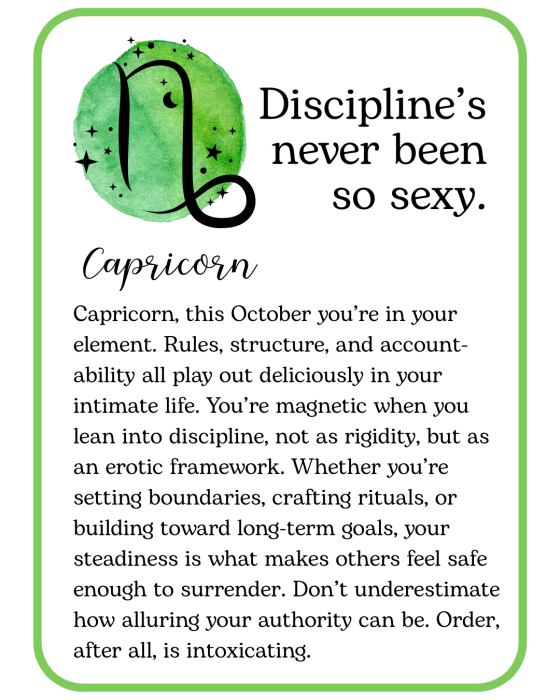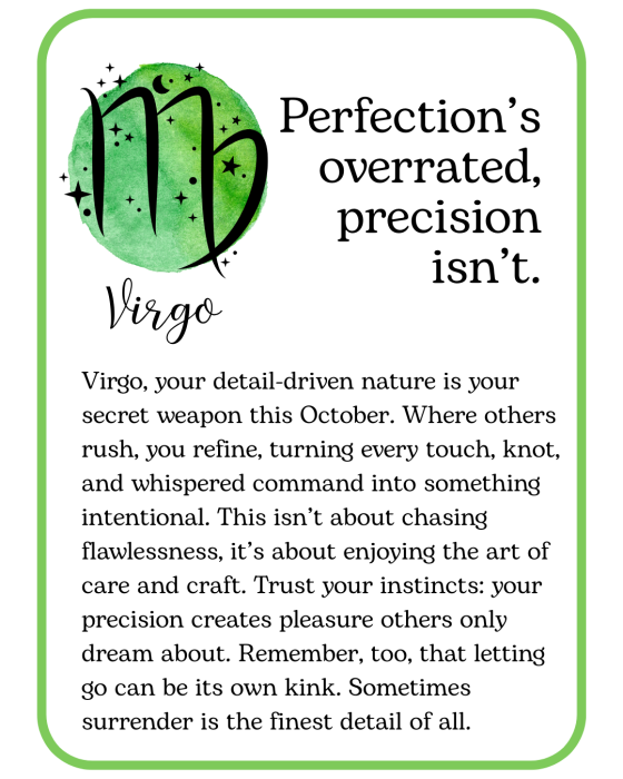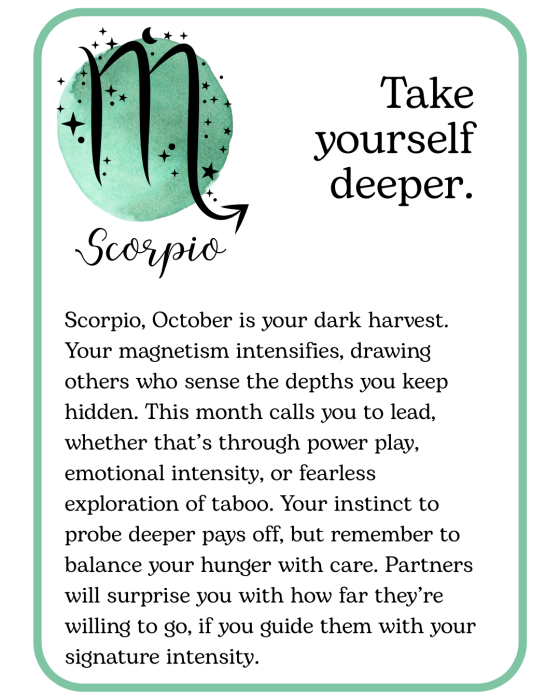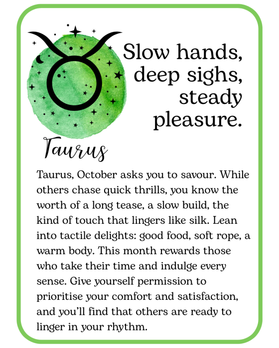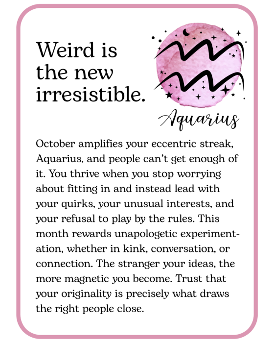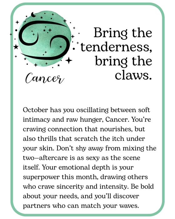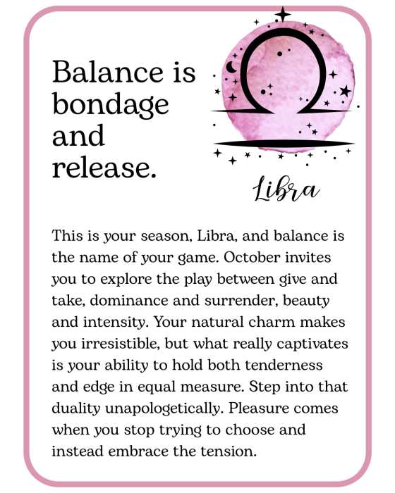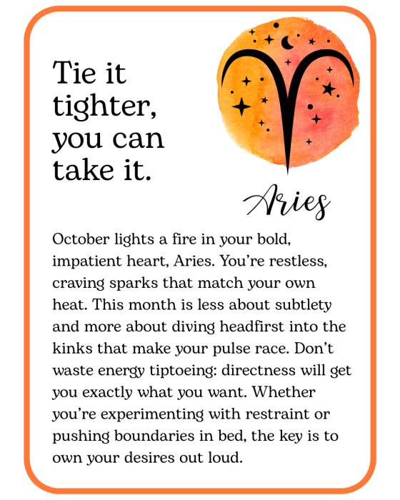 October is here, with cooler nights, longer shadows, and a little extra spark in the air. Think of this month’s kinky horoscopes as a playful guide to pleasure and possibility, something to inspire you, tease you, and maybe tempt you into trying something deliciously new. Read your sign, read your lover’s, or read them all… you never know where desire might take you!